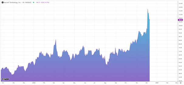 That said, the company faces potential risks. Any slowdown in the growth of the AI sector or delays in equipment purchases from major customers like Amazon or Microsoft could negatively impact its financial performance. Additionally, with Amazon stock price serving as a barometer for broader tech sector trends, Marvell remains sensitive to shifts in market sentiment. Marvell’s shares also trade at a 21% premium to Nvidia’s valuation multiple, leaving it vulnerable to market corrections. Its high market valuation brings heightened expectations to sustain growth, even amid potential demand fluctuations in the future.