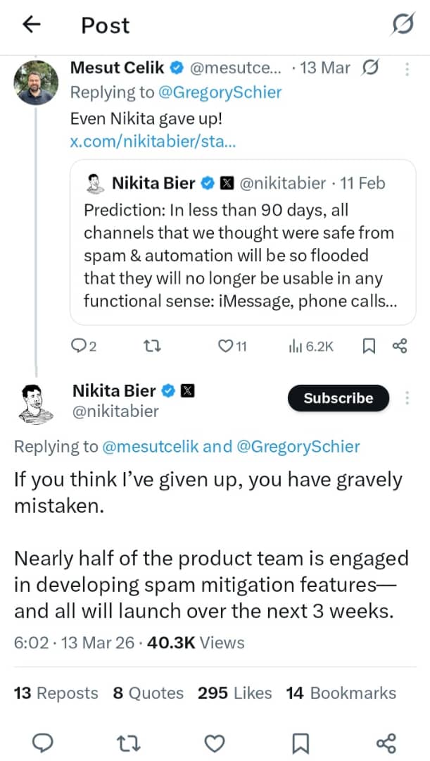 A few days ago, Elon Musk and the X engineering team were vocal about their goal to clean up the platform from bots. According to an X reply from Nikita Bier, the company’s product head, more than half of the product team is actively working to reduce spam.