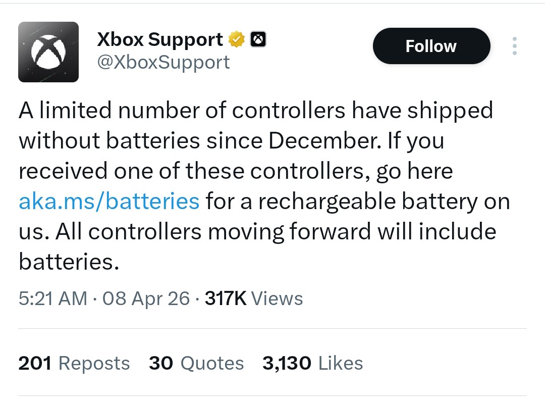 In a recent post on X, Xbox Support mentioned that affected players can visit aka.ms/batteries to claim a free rechargeable battery. The post further clarified that the affected players are those who purchased from the limited pieces shipped in December.